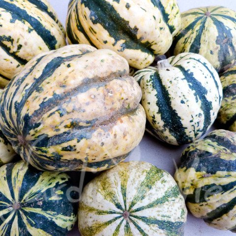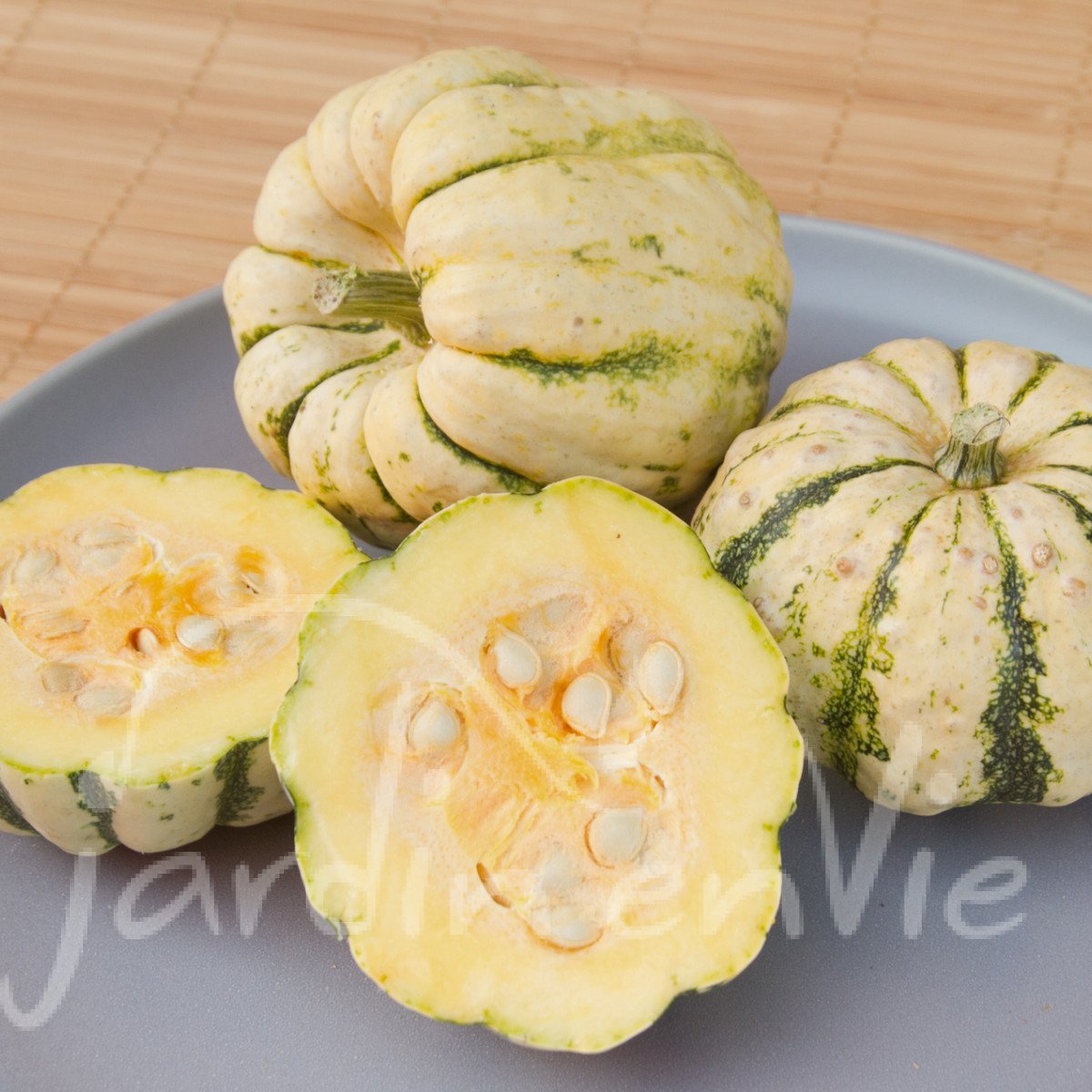 (Cucurbita pepo). Variété coureuse. Petits fruits blanc rayé de vert. Chair douce, orangée, délicieux goût de noisette, peau fine, ne se pelle pas. Jeune il peut se manger comme une courgette. Se conserve tout l'hiver s'il est ramassé mûr. Utilisation : crue rapée (vinaigrette), cuite en purée, potage, bavarois, gâteau, tarte, confiture. (env 20 grn/g)