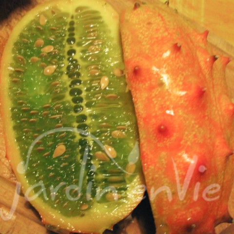 (Cucumis metulifer). Fruit ovale hérissé de pointes. Sa chair rappelle celle du fruit de la passion. Saveur acidulée (banane verte). Se conserve à température ambiante (pas de frigo). Semis sous abri en mars, repiquage en avril. Récolte de juil à sept lorsque le fruit est orange. (env. 30 grn/g)