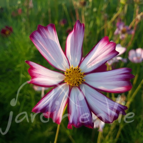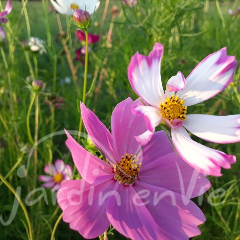 (Cosmos bipinnatus – Asteracée). Annuelle. Grande plante (> 1 m) au feuillage très finement découpé. Fleurs roses ou blanches très décoratives en massif et en bouquet. Culture très facile. Semer en place ou en pépinière de mars à mai. Floraison prolongée de juillet aux gelées . (env 200grn/g)