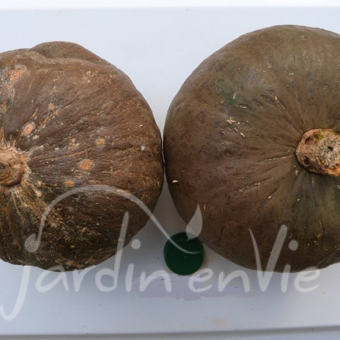 (Cucurbita maxima). Plante coureuse produit de 2 à 5 fruits de couleur gris ardoise de forme ronde et aplatie, d'environ 2kg. Chair d'excellente qualité, orange foncé, ferme et non fibreuse, goût sucré. Une mine de vitamines (A, E) et de minéraux, très concentré en oligo éléments, il pousse partout et n'exige qu'un sol bien ameubli et des arrosages réguliers. (env. 5 grn/g)