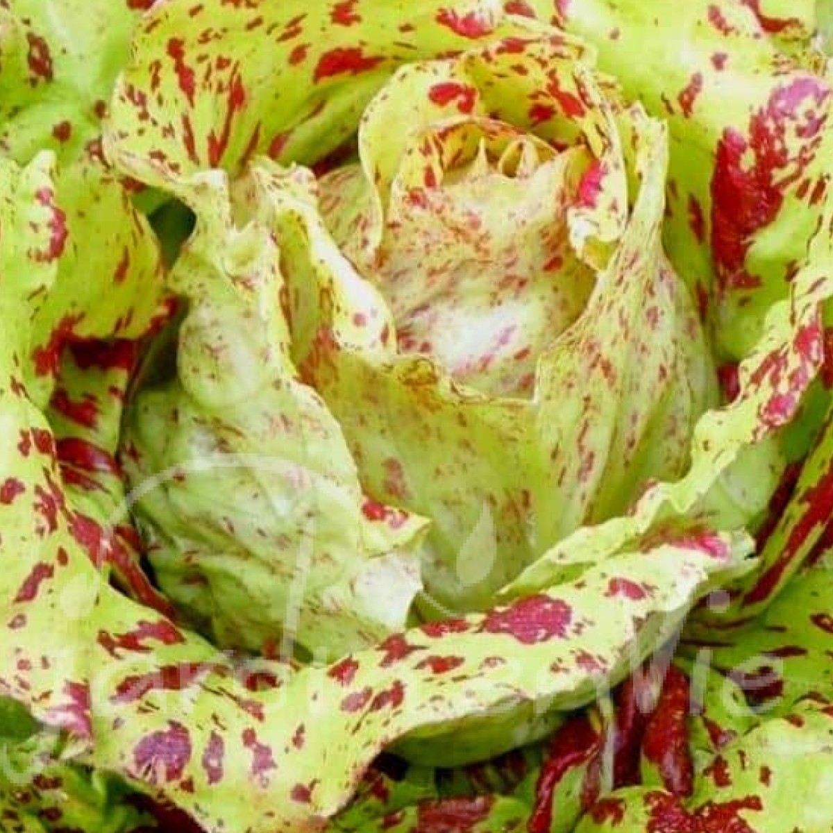 (Cichorium intybus L. Astéracée). Superbe variété italienne appelée rose comestible en raison de sa beauté. Pommes en forme de rose aux feuilles larges de couleur blanc crème tachetées de rouge. La saveur à la fois sucrée et amère est délicate. Récolte 85-90 jours après plantation.