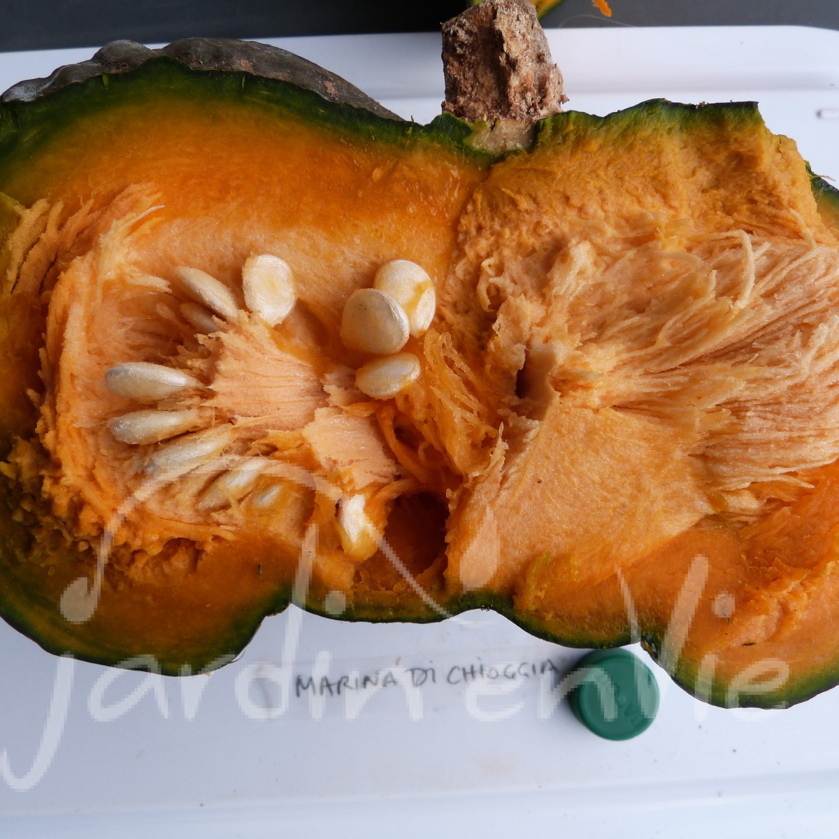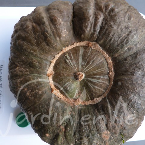 (Curcubita maxima).Variété à gros fruits vert-bleu, couvert d'excroissances. Chair orange foncé très parfumée. Variété vigoureuse et productive, de 3 à 6 fruits par plants. Bonne conservation. (env 3 à 4 grn/g)
