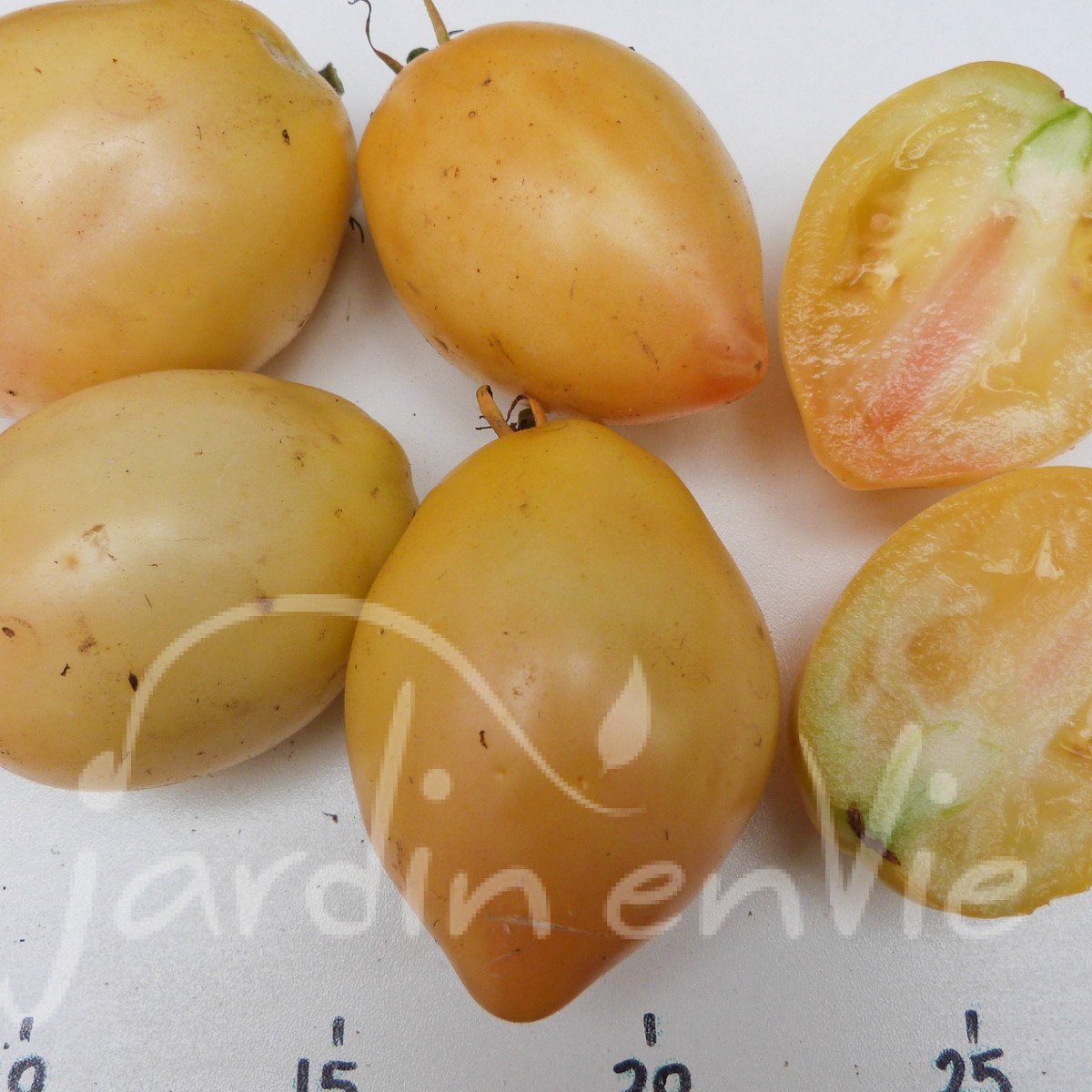 Variété de cœur de bœuf productive et résistante aux mauvaises conditions de fin de saison. Fruit blanc de 250 à 500g cordiforme. Variété à croissance indéterminée. Chair douce et juteuse comparable à la saveur de la tomate Ananas en plus ferme et moins sucrée.