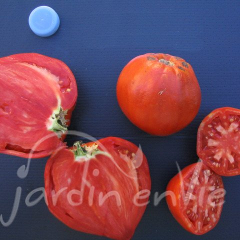 Belle tomate en forme de cœur de bœuf autour de 220 à 250g par fruit. De couleur rouge vif, sa saveur est douce. Il contient peu de jus, peu de graines. Sa peau est lisse. A consommer rapidement après la cueillette. Variété à croissance indéterminée.
