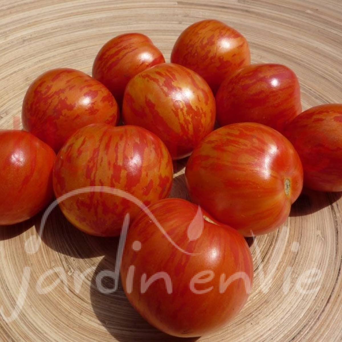 Petite tomate rouge veinée de jaune, précoce, de bonne saveur. Le pied est original par son port de petit arbuste, et la couleur d'un vert très clair de son feuillage. Hauteur de 30 à 40 cm maxi Convient bien à la culture en pot, voire en intérieur.