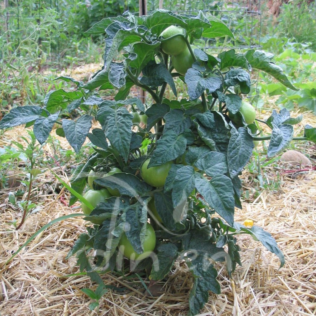 Étonnante variété créée par Pascal Poot dans l'Hérault. Les plants ne dépassent pas 60cm de haut et se tiennent sans tuteur comme un petit arbre. Les fruits rouges sont de belle taille (5 à 7 cm) relativement à celle du plant. Particulièrement résistante à la sécheresse, elle peut aisément se cultiver en pot