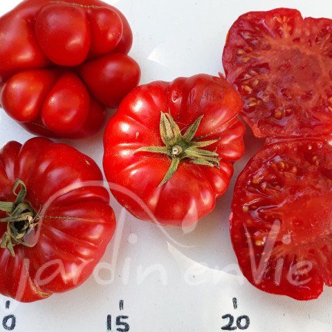 Variété très originale de fruits formé de 6 à 8 tomates fusionnées en une. Fruits rouges de 80 à 200 gr, saveur très légèrement acidulée, pour les salades.