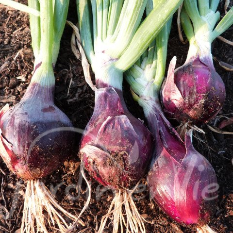 Oignon rouge foncé bien coloré. Rond à rond-plat. Variété vigoureuse et rustique. Pour récolter frais et la conservation. Seulement en semis direct. Se sème en place en mars avril en rangs espacés de 25 cm pour récolte en août-sept. Eclaircir à 5 cm.
