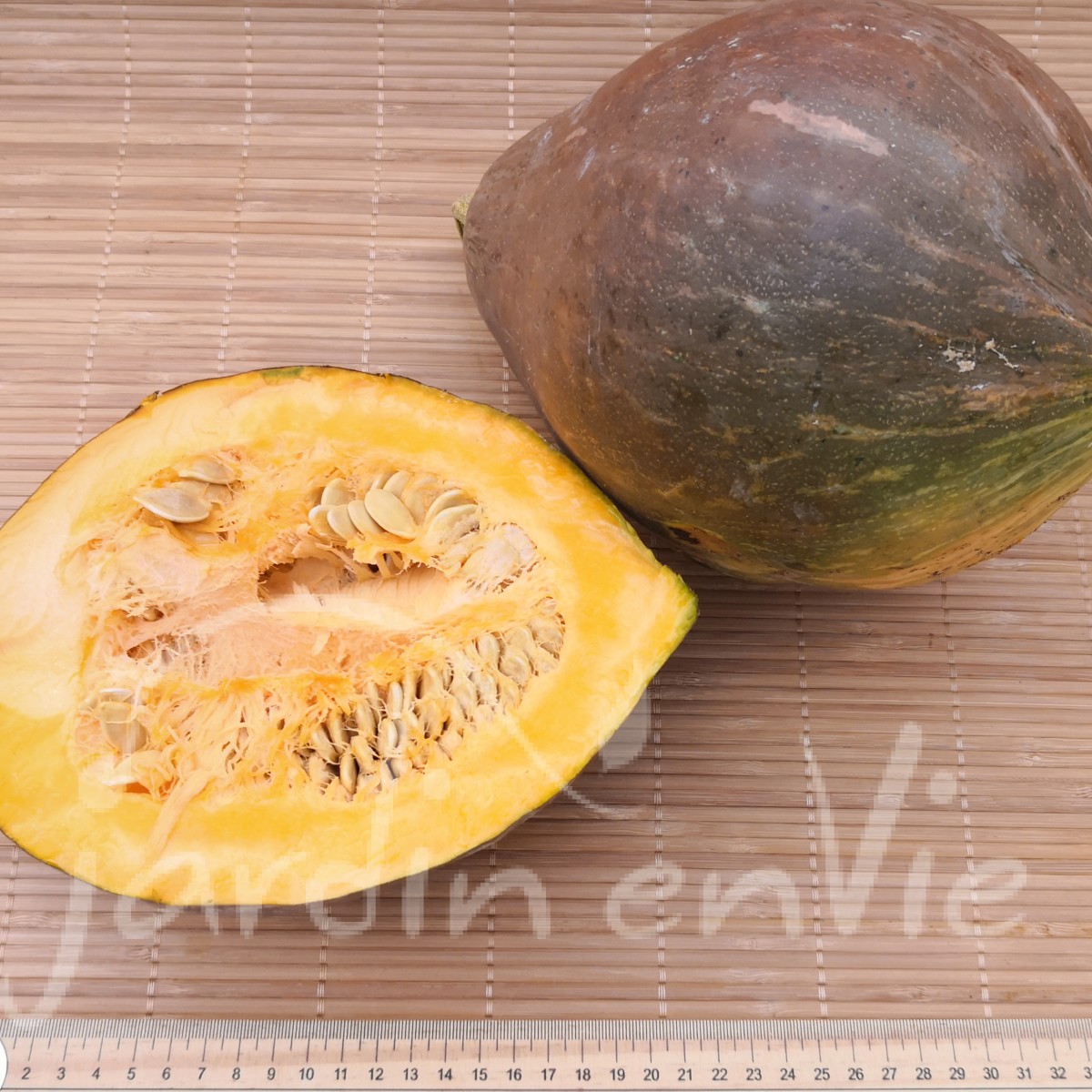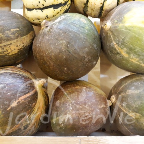 (Cucurbita maxima) Fruit de 3 à 6kg, extérieur lisse couleur vert olive, intérieur jaune. La peau s'enlève facilement ou peut se consommer. La chair est tendre et nous conseillons de le pas la cuire trop longtemps. Conservation moyenne. (env. 7 grn/g)
