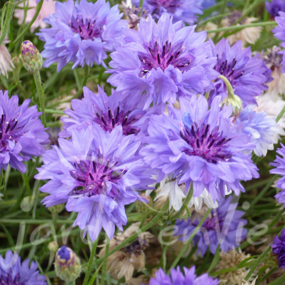 (Centaurea cyanus L. - Asteracée). Plante annuelle messicole. Cette plante développe des tiges ramifiées surmontées d'une multitude de fleurs doubles, de couleur bleue, parsemées de rose et de violet. Plante rustique très décorative pour le jardin. Peut s'utiliser en fleur coupée. H=1 m. Flor. juill-août. Réussit bien en sols arides. Semis automne ou printemps. Le semis en sept. donne une floraison plus précoce et plus abondante semer clair (2-3 gr en poquets tous les 25-30 cm) ou éclaircir à 25-30 cm. (env 450 grn/g).