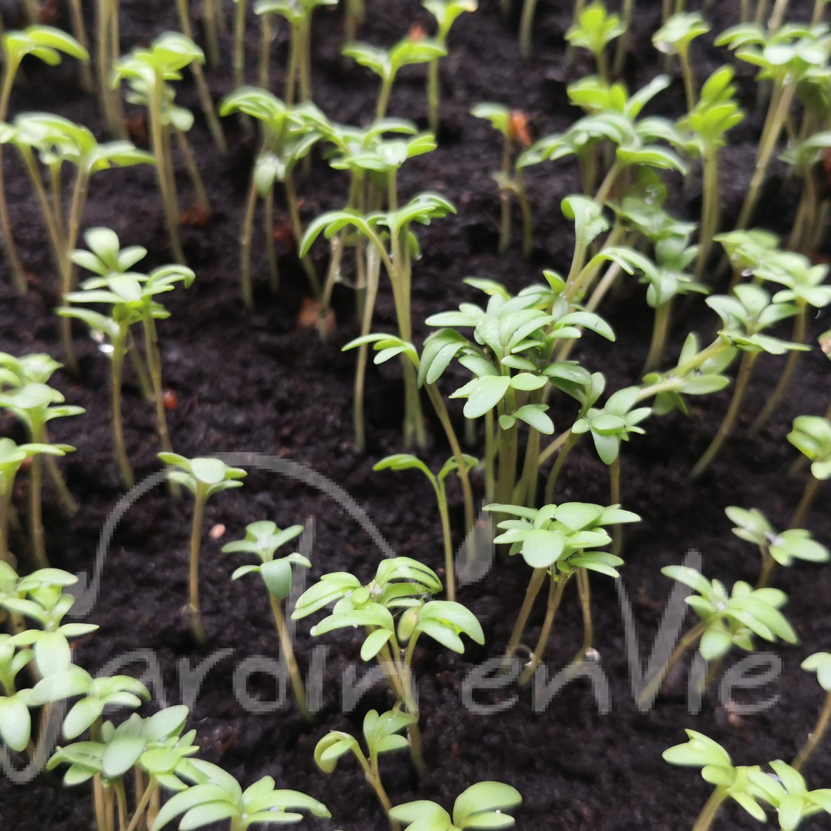 Vos premières salades de printemps, très riches en vitamines! Forçage facile, même en pots ou caissettes dans votre maison (idéal pour crudivores!). Germination: 3-5 jours. Vous pouvez amuser vos enfants en faisant des dessins ou en écrivant leurs noms sur la plate-bande (semer assez dru). Semis répétés de mars en sept, à la volée, en pleine terre. Situation ombragée en été. Arrosages fréquents, récolte régulière en coupant les feuilles. (env 450 graines/g).