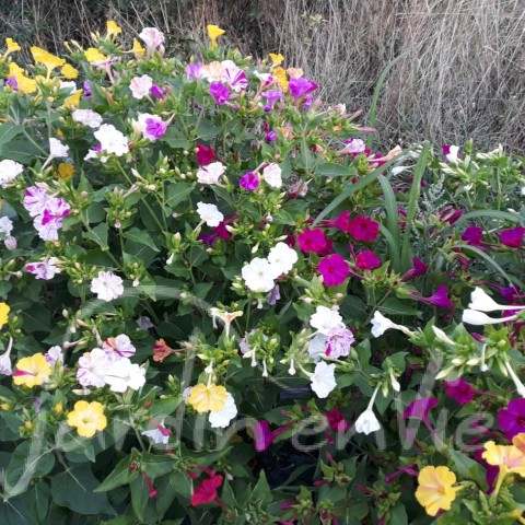 (Mirabilis jalapa L. – Nyctaginacée). Plante annuelle formant une touffe érigée et ramifiée de 25/30cm environ. Elle peut se comporter en vivace grâce à ses bulbes. Les arracher avant l'hiver et les replanter à 8 cm de profondeur. Les fleurs en forme d’entonnoir, apparaissent au dessus du feuillage. Elles s'ouvrent à la fin du jour. Culture très facile. Semez directement en place de mars à juin, à raison de 4 à 5 graines tous les 30cm. Arrosez pour faciliter la levée et laissez en touffes. Floraison Juin à oct en situation ensoleillée. Haut 30-40cm