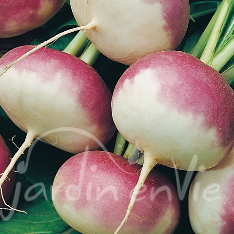 Racine aplatie blanche à collet rose. Variété très précoce homogène à feuillage long, Résiste bien à la montée à graine.