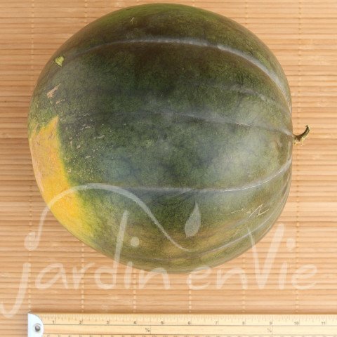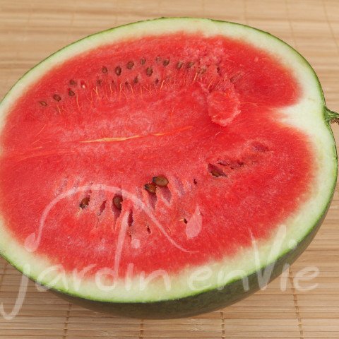 (Citrullus lanatus – Cucurbitacée) Fruit de 20cm de diamètre de 2 à 4kg. Chair rouge foncée, très sucrée et rafraîchissante. De culture assez facile au sud de la Loire. Elle craint les excès d'eau et préfère une terre riche et bien aérée. Semis en avril en godet ou en place en mai (sol bien réchauffé) dans un trou rempli de compost à 1x1m. (env. 20 grn/g)