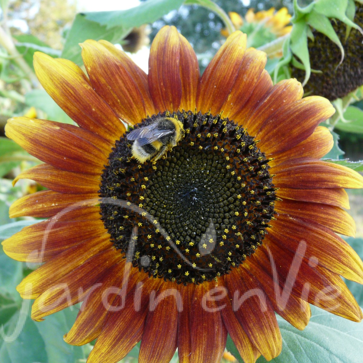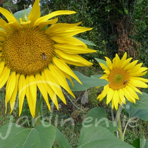 Très beau mélange de tournesols de 1,5 à 2,5 m de haut. Floraison échelonnée pendant 2 mois: fleurs toutes jaunes doubles ou simples et fleurs jaunes et brun rouge. Graines noires striées ou brun rouge. (env 30grn/g)
